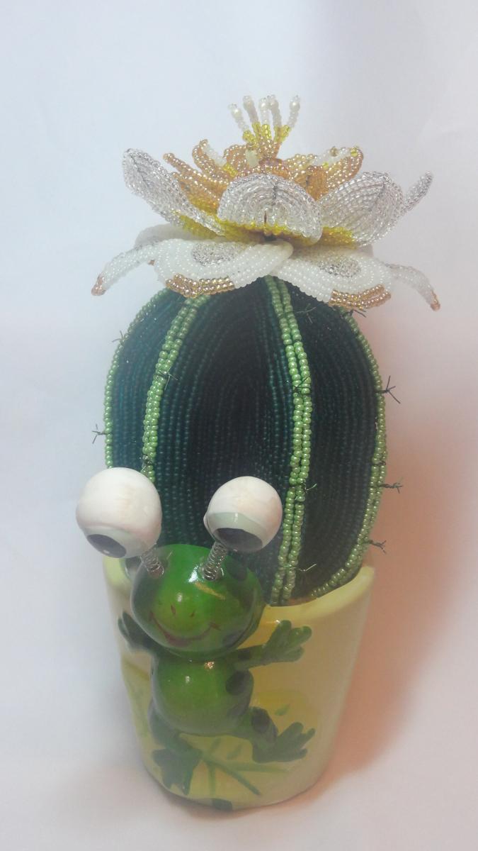 Если кому интересно, здесь почти 100г изумрудного бисера (№50710), край листа сделан более светлым цветом (номер не сохранился). Еще где-то 50г ушло на цветок: там белый полупрозрачный (№02090), белый прозрачный (цвет не сохранился), желтый прозрачный (№80010) и медовый (№16050). И горшочек wink.gif