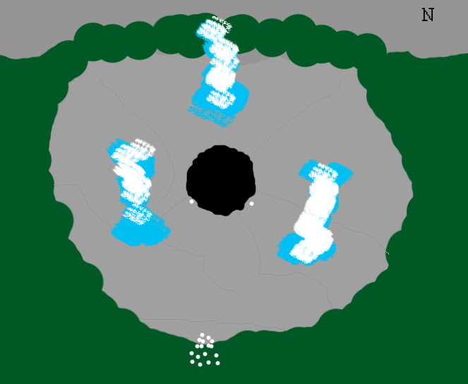 Неожиданно для конвоируемых, заросли расступились, и они оказались на краю джунглей, а внизу, с небольшим перепадом (футов десять-пятнадцать) начиналась каменная равнина. Слева и справа, в отдалении, круг равнины был также ограничен деревьями, а спереди - возвышался отвесной склон серой скалы. По центру равнины - зиял черный широкий провал, чем-то напоминавший колодец и ведущий куда-то глубоко под землю. У его краев стояли двое вольных, судя по всему, стражники. Пространство равнины было испещрено гейзерами, которые ежеминутно извергали на поверхность потоки горячей воды, из-за чего даже сейчас в воздухе висел водяной туман и можно было наблюдать радугу.