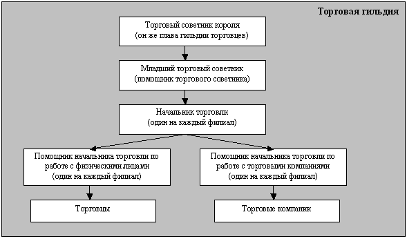 Как видно из схемы, в торговую гильдию входят не только отдельные физические лица (торговцы), но и целые торговые организации. С одной стороны с организациями работать значительно проще, так как они сами разбираются со своими служащими и вносят в казну гильдии суммарный налог, но с другой стороны именно за организациями нужен глаз да глаз. Нередко, а точнее довольно часто торговая гильдия пользуется помощью ревизоров цеха банкиров.